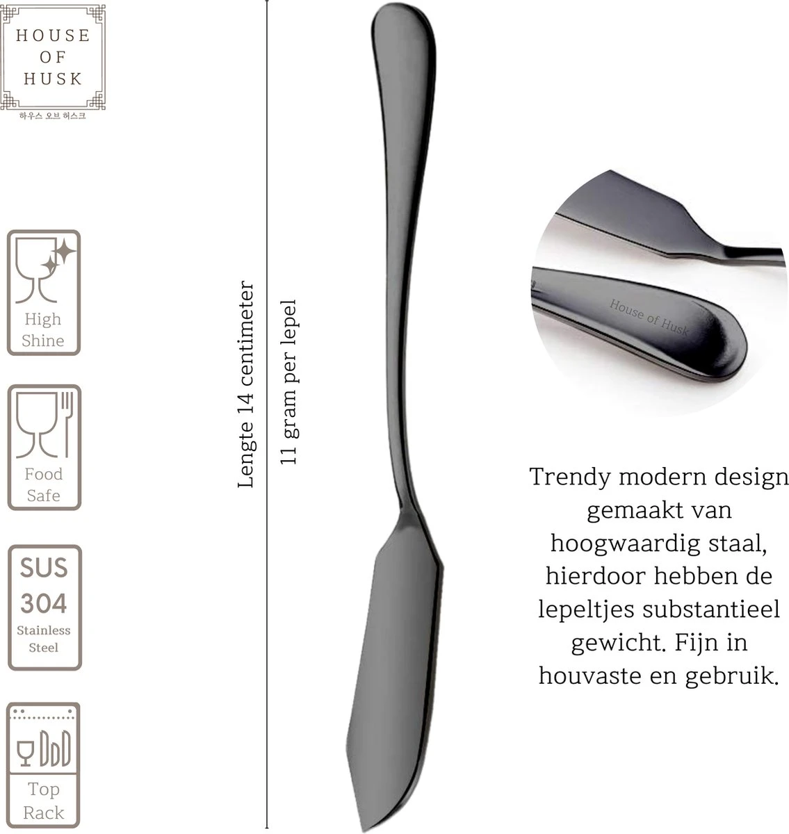 Al ons House of Husk™ bestek wordt gemaakt van kwaliteit 304 roestvast staal. Ondanks het slanke design van het bestek ligt het bestek fijn in de hand door de dichtheid van het staal, wat voor een fijn gewicht zorgt. Ons bestek kan in de vaatwasser. LET OP: Mocht u ervoor kiezen om ons bestek te wassen in een vaatwasser, kies hiervoor een programma met een temperatuur niet hoger dan 40ºC en een zacht tot mild reinigingsmiddel (fosfaatgehalte van max. 3%, zuur kan bijten in het bestek). Om de afwerking van onze producten zolang mogelijk mooi te houden, raden wij handwas aan, zonder schuursponsjes, bleekmiddelen en soda.