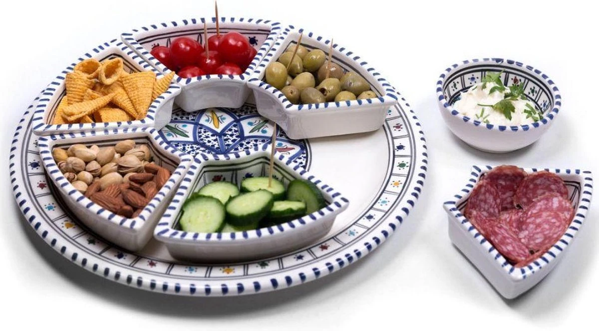 Creëer een verbluffende hapjes presentatie tijdens een gezellige bijeenkomst met deze Marokkaanse handgemaakte serveer set.