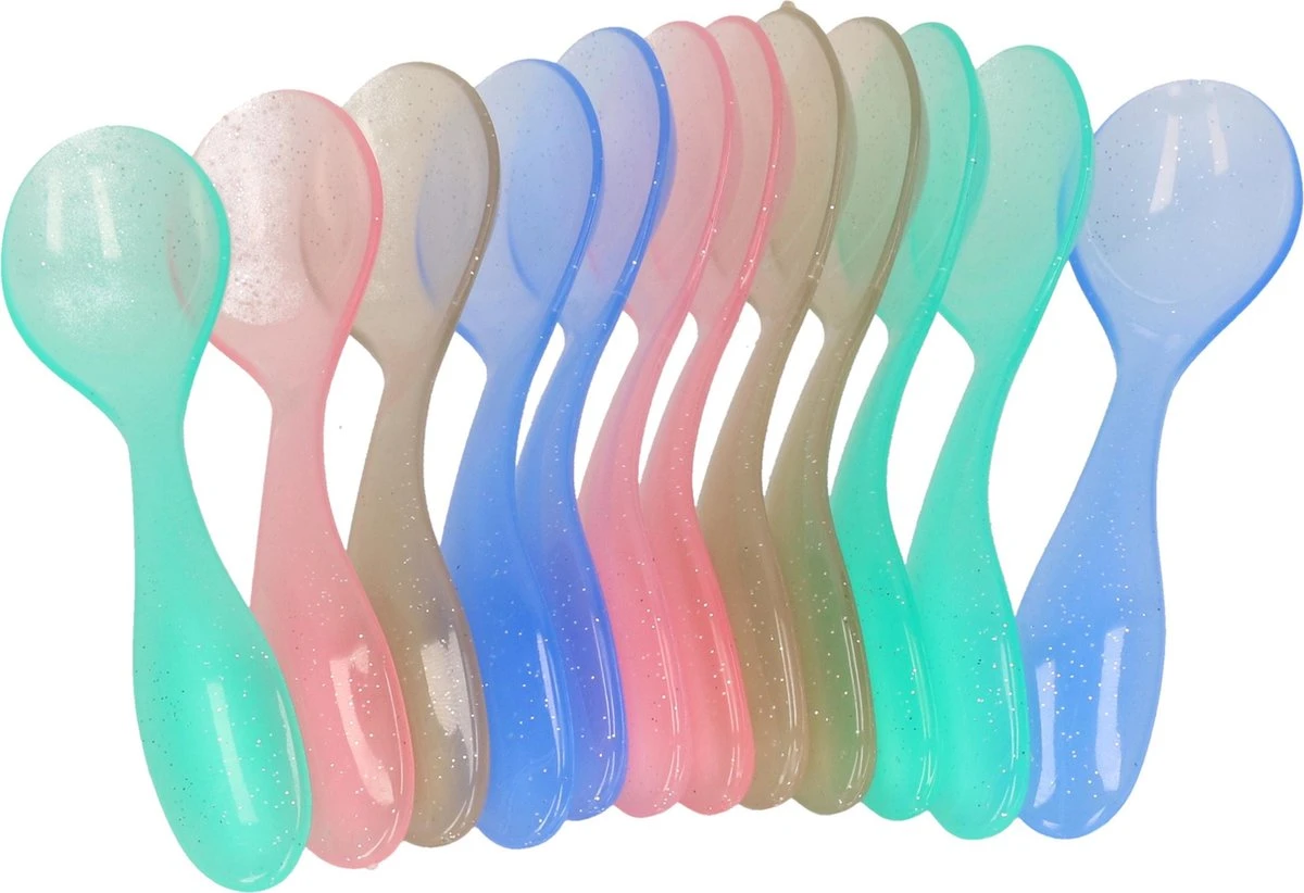 12x Kunststof eierlepels in verschillende kleuren. Kleuren zijn: roze, geel, blauw en groen. Formaat: 10 cm. Let op: weggooien hoeft niet, want deze lepels zijn herbruikbaar.