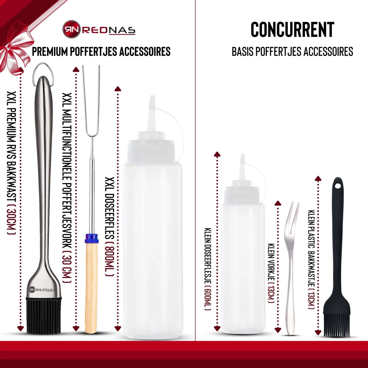 Gun jezelf de luxe van deze premium set, bestaande uit een Rednas Poffertjespan, Rednas Bakborstel, Rednas Doseerfles, Rednas Siliconen handvatten en Rednas Poffertjesvork. Je ontvangt de set in een luxe giftbox. Leuk om zelf uit te pakken of om cadeau te geven: praktisch, origineel én van hoogwaardige kwaliteit! Ideaal voor een housewarming, de feestdagen, vader- of moederdag of een verjaardag! Wie verras jij hiermee?