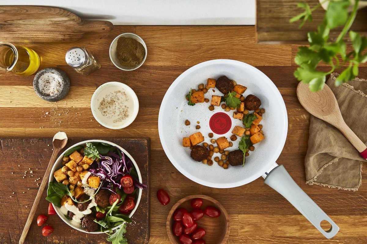 Gezonde, natuurlijke maaltijden vereisen bijpassende kookgerei. Met Tefal Natural Chef weet je zeker dat je pannen het milieu op de eerste plaats zetten. De body van 100% gerecycled aluminium is uiterst milieuvriendelijk, vereist tot 90% minder energie om te produceren en vermindert de voetafdruk van het product met maar liefst 60%. Een tastbaar gebaar om het milieu te helpen. Het assortiment is voorzien van een veilige, krasbestendige keramische coating die heerlijke resultaten belooft, knapperig tot in de perfectie. Ideaal voor het bereiden van een breed scala aan verse, natuurlijke ingrediënten. Dankzij de Thermo-Signal™ warmte-indicator weet je wanneer de pan de juiste temperatuur heeft bereikt, waardoor je gegarandeerd perfecte bakresultaten behaald.
